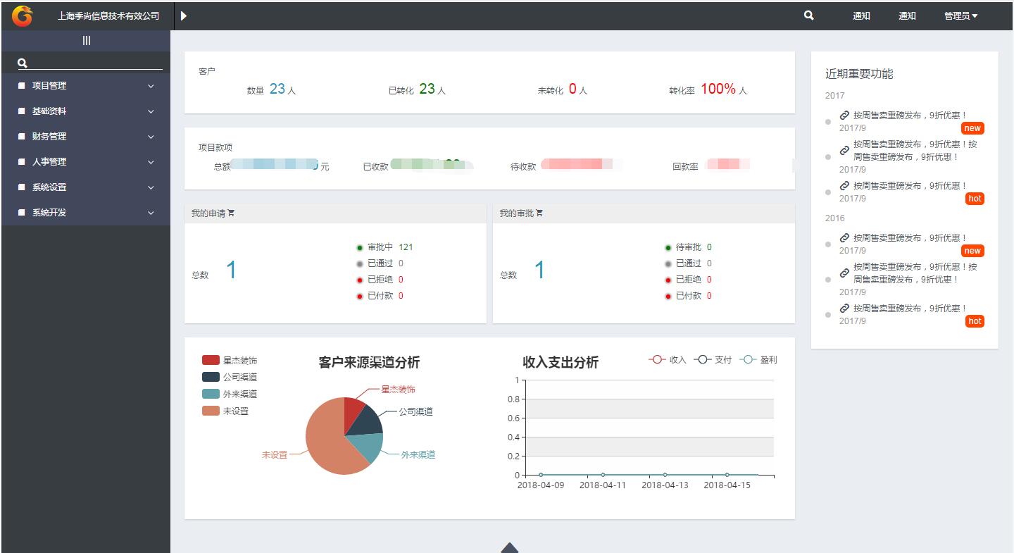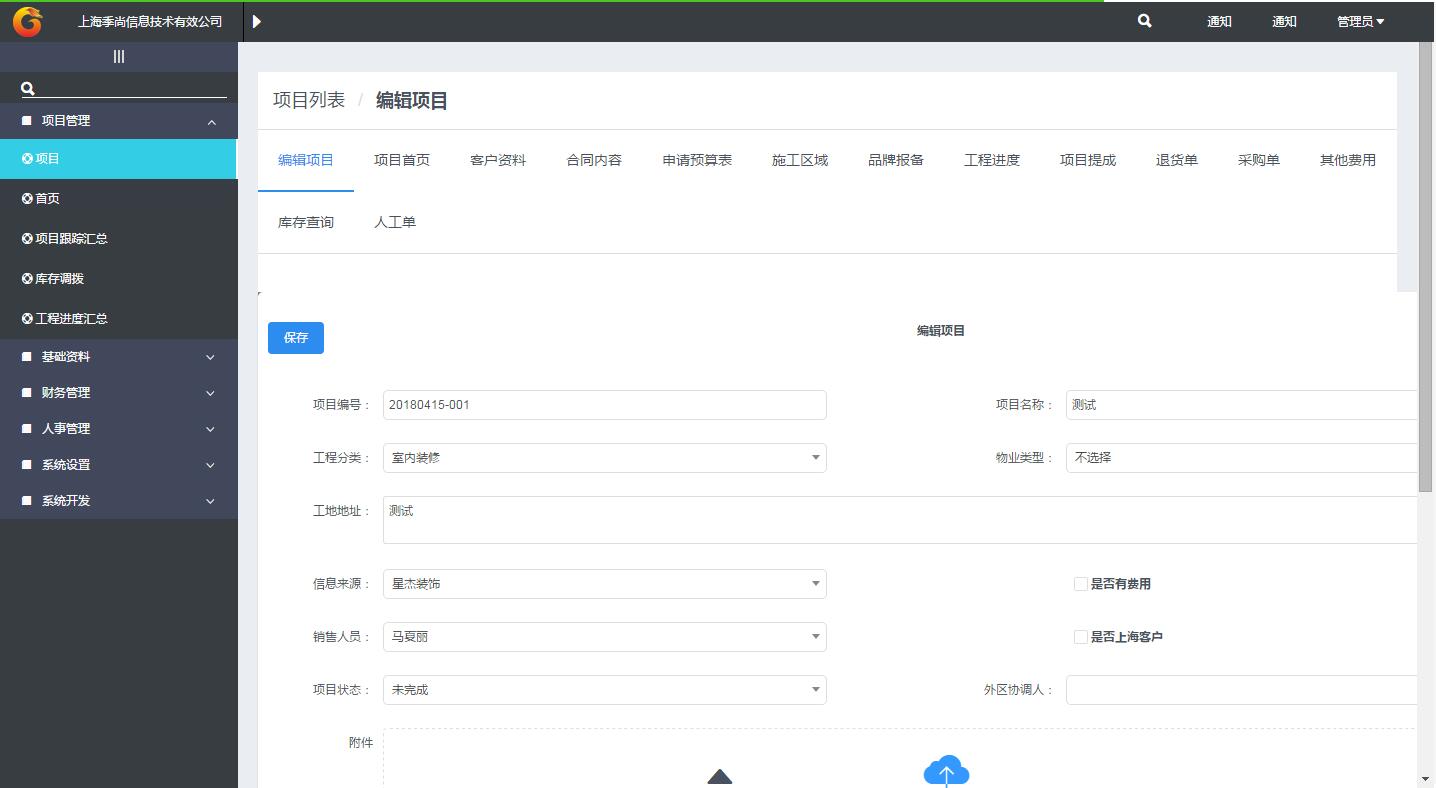 主要包含了:客户资料管理、客户跟踪。多次的预算报价单管理、人工费用统计、装修工程进度管理汇总、收款管理、员工工资统计、借款申请审批等装修公司在工程项目管理中涉及到的工作流程,解决装修公司信息一体化的难题,有序、有据可查的进行项目管理、成本把控等。
